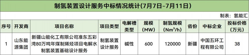 據統計,本周1個制氫裝置設計服務項目開標,該項目為新疆山能化工有限公司準東五彩灣80萬噸年煤制烯烴項目電解水制氫裝置基礎設計服務,規模為600MW,制氫規模120000Nm3/h,由中國五環工程有限公司中標,投標報價總計38萬元。