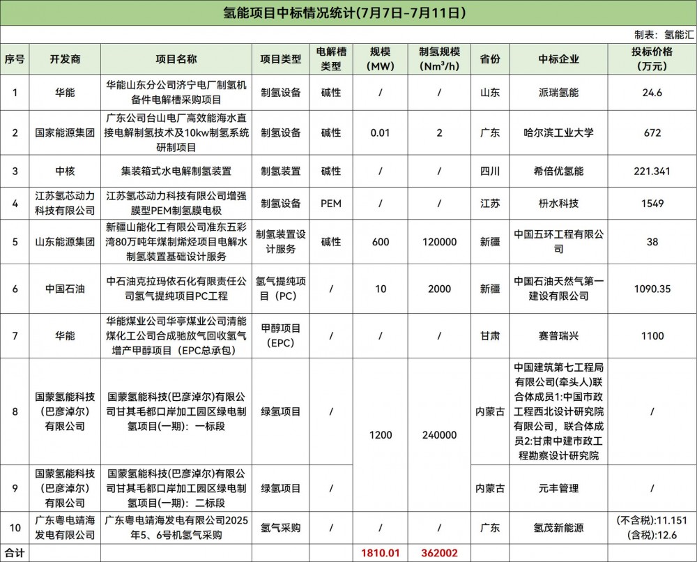 7月7日-7月11日氫能項目招投標方面,累計中標項目有10個,規模總計1810.01MW,制氫規模總計362002Nm3/h。招標項目有7個,規模總計480MW,制氫規模總計96000Nm3/h。