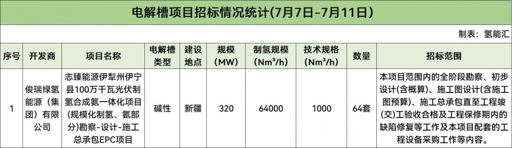 據統計,本周電解槽項目招標市場方面,共1個項目啟動采購,規模總計320MW,制氫規模為64000Nm3/h。項目開發商為俊瑞綠氫能源(集團)有限公司。