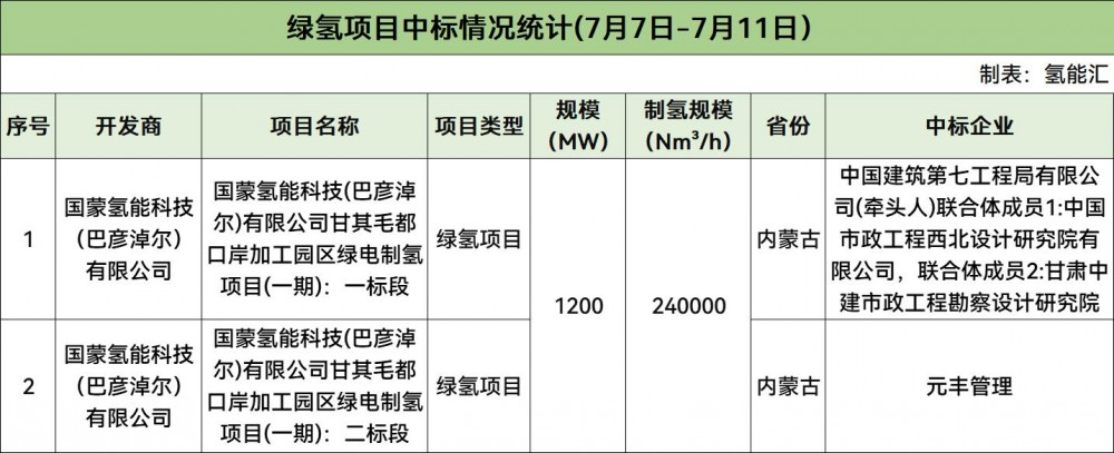 本周綠氫中標項目有2家,招標人是國蒙氫能科技(巴彥淖爾)有限公司,中標企業為中國建筑第七工程局有限公司(牽頭人)聯合體成員1:中國市政工程西北設計研究院有限公司,聯合體成員2:甘肅中建市政工程勘察設計研究院;元豐管理。