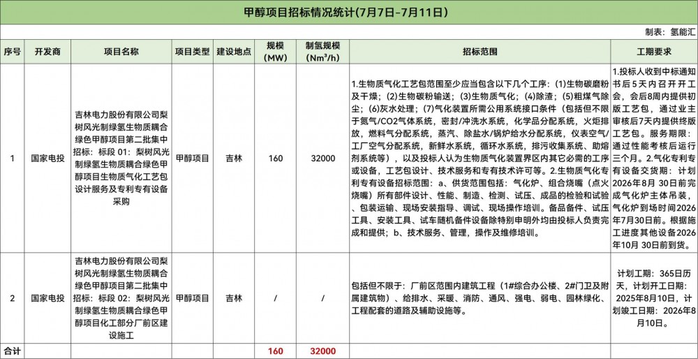 吉林電力股份有限公司梨樹風光制綠氫生物質耦合綠色甲醇項目第二批集中招標,標段01:梨樹風光制綠氫生物質耦合綠色甲醇項目生物質氣化工藝包設計服務及專利專有設備采購,本項目采用“新能源電解水制綠氫”耦合“生物質氣化制合成氣”技術,經凈化、甲醇合成等工藝,建設年產19.7萬噸精甲醇,氣化裝置設置單系列,凈化裝置及甲醇裝置均為單系列。電解水裝置制氫規模為3.2萬Nm3/h,平均供氫量1.36萬Nm3/h。本項目生產裝置有空分裝置、生物碳裝置、生物質氣化裝置、氣體凈化裝置、電解水制氫裝置、甲醇裝置。公用及輔助工程有給水及消防水站、循環冷卻水站、泡沫消防站、除鹽水站、回用水站、蒸發結晶、污水處理站、事故水池、余熱發電、動力站、空壓站、換熱站、甲醇罐區、氫氣罐區、裝車棧臺、固體貯運設施、火炬、全廠供配電設施、全廠控制系統、全廠給排水管網、全廠外管、全廠通信、全廠通訊、及總圖運輸等。項目整體進度:現場開工日期2025年9月10日,計劃完工并產出合格甲醇日期2027年6月30日。