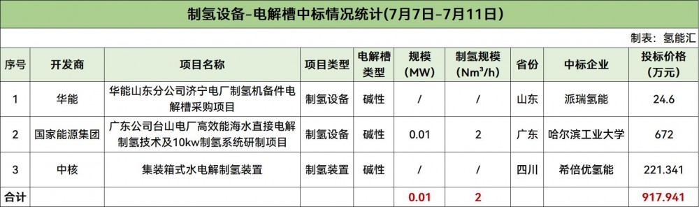 據統計,本周3個電解槽項目開標,規模為0.01MW,制氫規模總計2Nm3/h,投標報價總計917.941萬元。