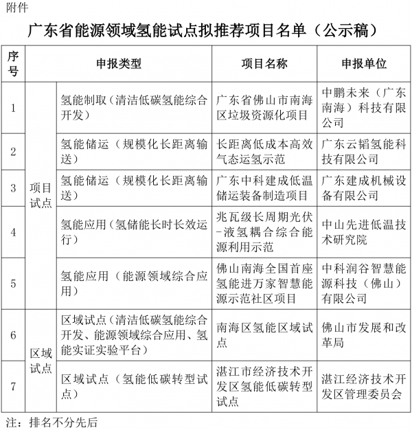 7月10日,廣東省能源局公示能源領域氫能試點推薦上報項目。