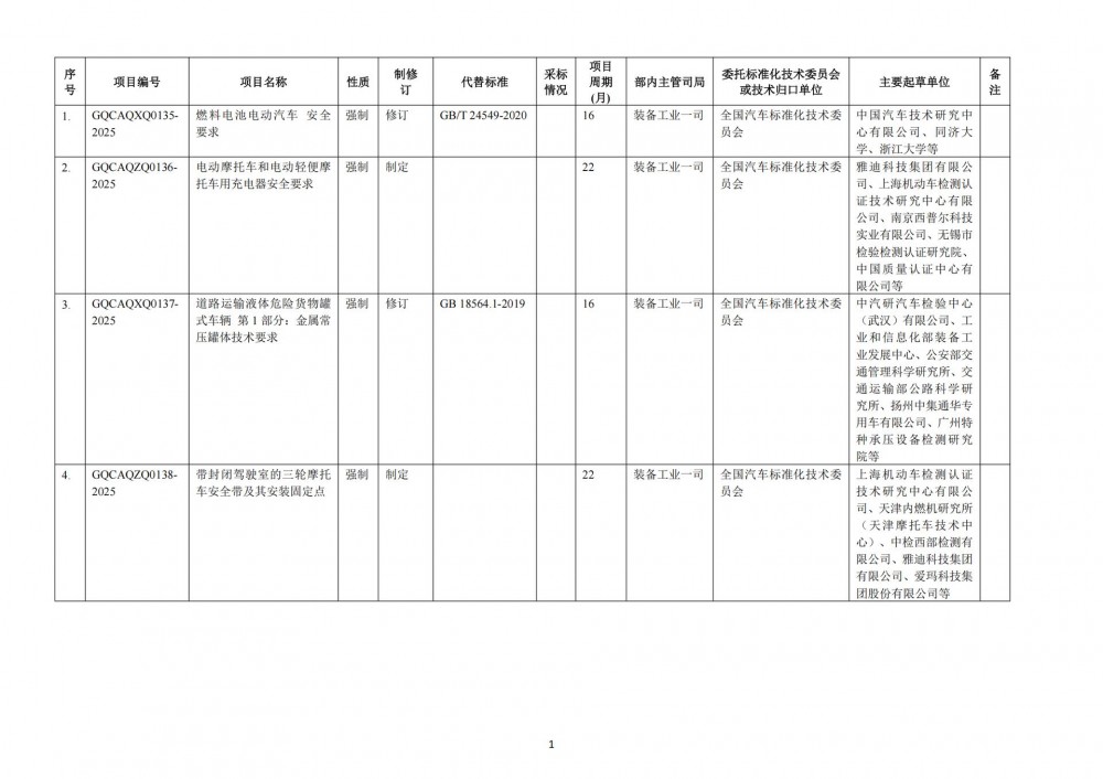根據標準化工作的總體安排,現將申請立項的《燃料電池電動汽車 安全要求》等4項強制性國家標準計劃項目予以公示(見附件1)。