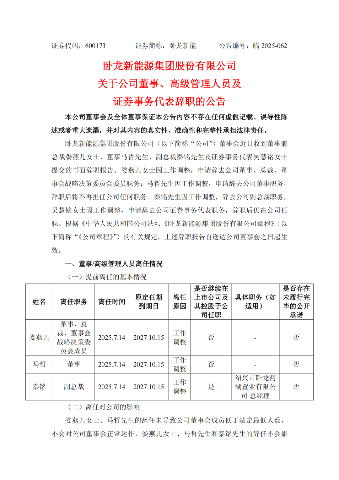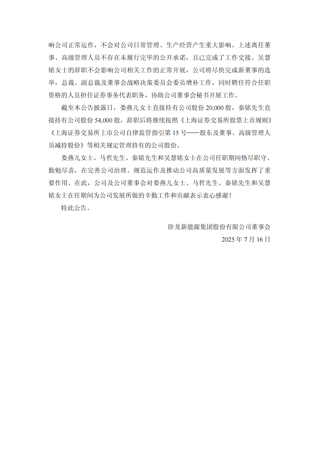 7月16日,臥龍新能源集團股份有限公司(簡稱:臥龍新能)發布關于公司董事、高級管理人員及證券事務代表辭職的公告。