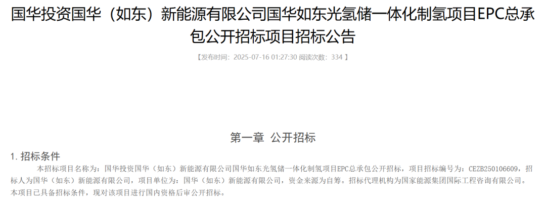 7月16日,國華投資國華(如東)新能源有限公司國華如東光氫儲一體化制氫項(xiàng)目EPC總承包公開招標(biāo):
