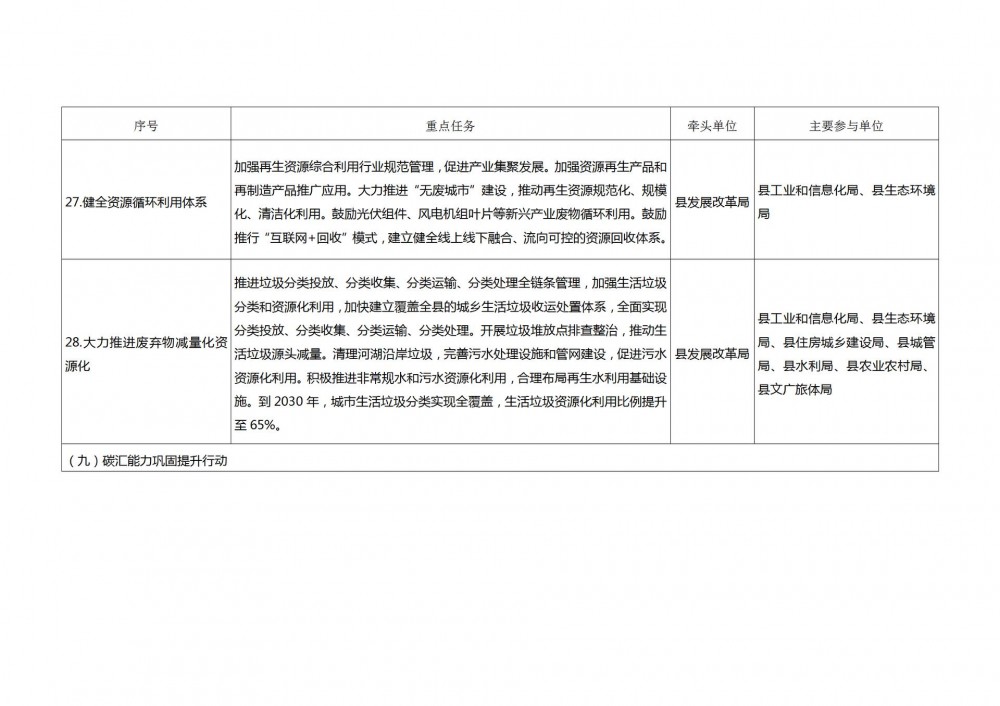 28.大力推進廢棄物減量化資源化。推進垃圾分類投放、分類收集、分類運輸、分類處理全鏈條管理,加強生活垃圾分類和資源化利用,加快建立覆蓋全縣的城鄉生活垃圾收運處置體系,全面實現分類投放、分類收集、分類運輸、分類處理。開展垃圾堆放點排查整治,推動生活垃圾源頭減量。清理河湖沿岸垃圾,完善污水處理設施和管網建設,促進污水資源化利用。積極推進非常規水和污水資源化利用,合理布局再生水利用基礎設施。到2030年,城市生活垃圾分類實現全覆蓋,生活垃圾資源化利用比例提升至65%。