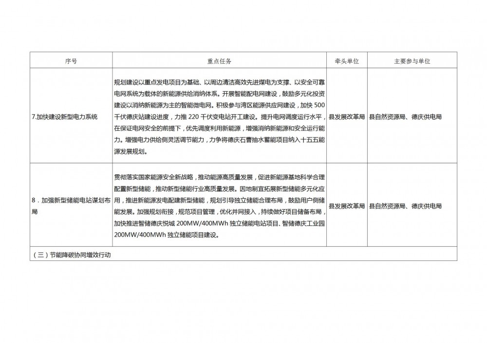 7.加快建設新型電力系統。規劃建設以重點發電項目為基礎、以周邊清潔高效先進煤電為支撐、以安全可靠電網系統為載體的新能源供給消納體系。開展智能配電網建設,鼓勵多元化投資建設以消納新能源為主的智能微電網。積極參與灣區能源供應網建設,加快500千伏德慶站建設進度,力推220千伏變電站開工建設。提升電網調度運行水平,在保證電網安全的前提下,優先調度利用新能源,增強消納新能源和安全運行能力。增強電力供給側靈活調節能力,力爭將德慶石曹抽水蓄能項目納入十五五能源發展規劃。