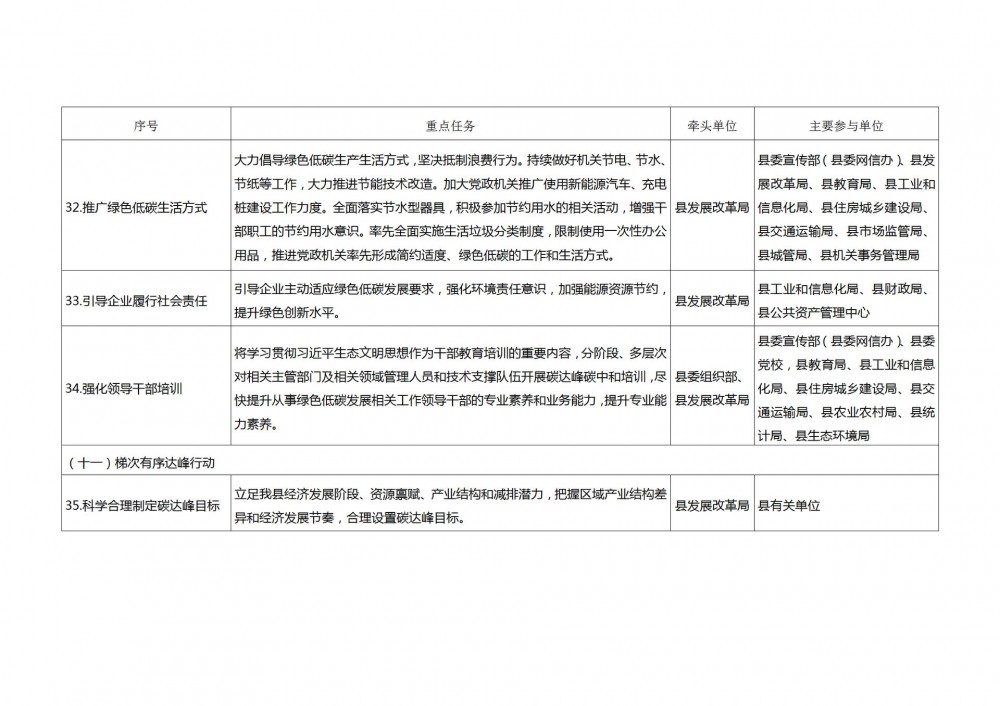 貫徹國家和省市關于碳達峰的重大決策部署,落實縣委、縣政府有關工作要求;縣發展改革局加強對各項工作的整體部署和系統推進,建立跨部門、常態化工作推進機制,協調跨部門職能的重大事項,對重大事項進行動態跟蹤和定期協調推進。縣有關單位要結合工作職責,做好各自領域的碳達峰工作,確保各項工作任務有布置、有督促、有落實、有結果。