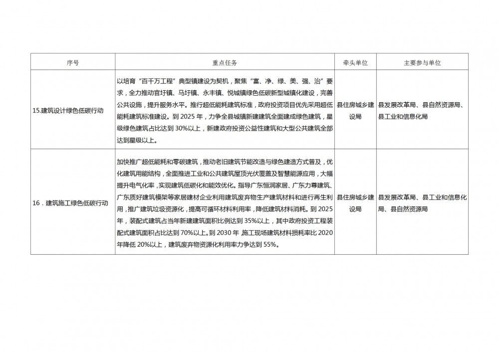15.建筑設計綠色低碳行動。以培育“百千萬工程”典型鎮建設為契機,聚焦“富、凈、綠、美、強、治”要求,全力推動官圩鎮、馬圩鎮、永豐鎮、悅城鎮綠色低碳新型城鎮化建設,完善公共設施,提升服務水平。優化城鄉空間結構,采用不同類型民用建筑的綠色建筑設計、施工驗收標準,鼓勵發展綠色建筑,城鎮新建民用建筑全面按照綠色建筑標準建設,大型公共建筑和機關事業單位辦公建筑、國有資金參與投資建設的其他公共建筑按照一星級及以上綠色建筑標準建設。推行超低能耗建筑標準,政府投資項目優先采用超低能耗建筑標準建設。編制綠色建筑發展專項規劃,綠色建筑項目嚴格按照《廣東省綠色建筑設計規范》進行設計和施工圖設計文件審查,開展綠色建筑驗收。到2025年,力爭全縣城鎮新建建筑全面建成綠色建筑,星級綠色建筑占比達到30%以上,新建政府投資公益性建筑和大型公共建筑全部達到星級以上。