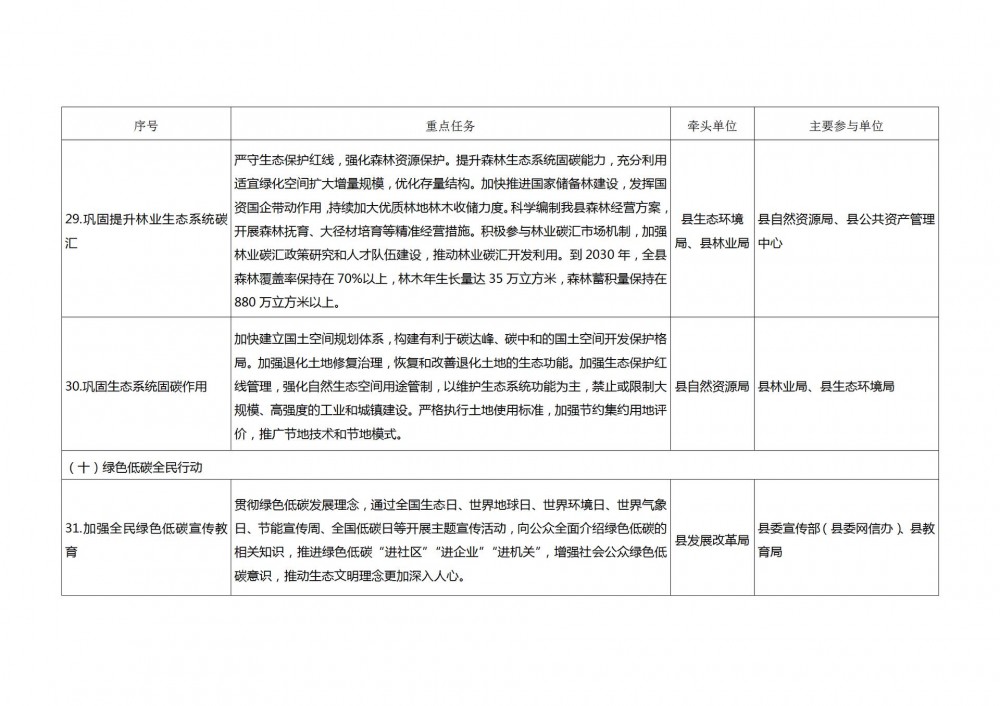 29.鞏固提升林業生態系統碳匯。嚴守生態保護紅線,強化森林資源保護。提升森林生態系統固碳能力,充分利用適宜綠化空間擴大增量規模,優化存量結構。加快推進國家儲備林建設,發揮國資國企帶動作用,持續加大優質林地林木收儲力度。科學編制我縣森林經營方案,開展森林撫育、大徑材培育等精準經營措施。積極參與林業碳匯市場機制,加強林業碳匯政策研究和人才隊伍建設,推動林業碳匯開發利用。到2030年,全縣森林覆蓋率保持在70%以上,林木年生長量達35萬立方米,森林蓄積量保持在880萬立方米以上。