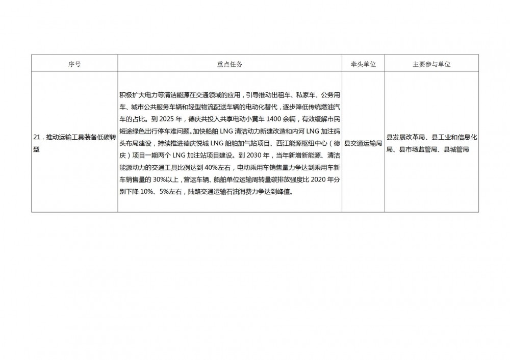 21.推動運輸工具裝備低碳轉型。積極擴大電力等清潔能源在交通領域的應用,引導推動出租車、私家車、公務用車、城市公共服務車輛和輕型物流配送車輛的電動化替代,逐步降低傳統燃油汽車的占比。到2025年,共投入共享電動小黃車1400余輛,有效緩解市民短途綠色出行停車難問題。加快船舶LNG清潔動力新建改造和內河LNG加注碼頭布局建設,持續推進德慶悅城LNG船舶加氣站項目、西江能源樞紐中心(德慶)項目一期兩個LNG加注站項目建設。到2030年,當年新增新能源、清潔能源動力的交通工具比例達到40%左右,電動乘用車銷售量力爭達到乘用車新車銷售量的30%以上,營運車輛、船舶單位運輸周轉量碳排放強度比2020年分別下降10%、5%左右,陸路交通運輸石油消費力爭達到峰值。