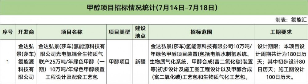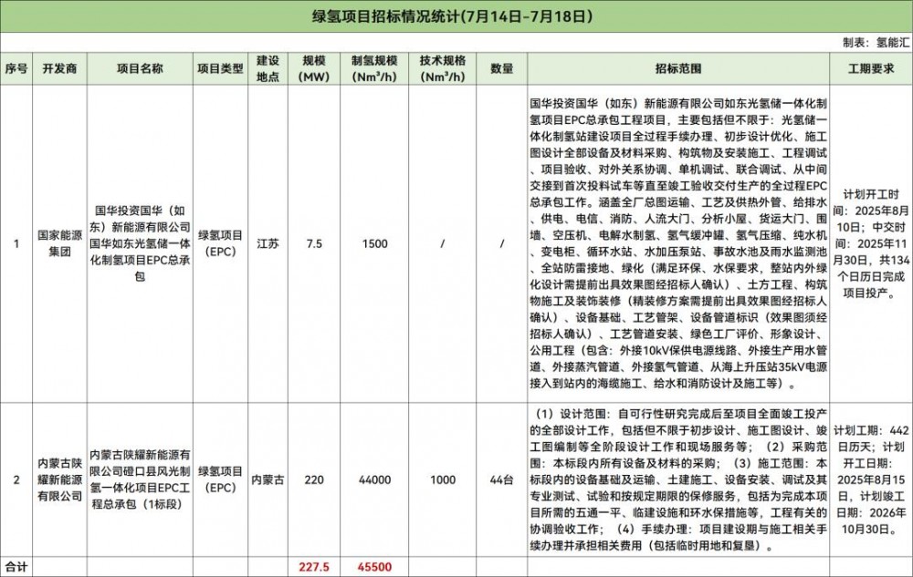 7月14日-7月18日氫能項目招投標(biāo)方面,中標(biāo)項目有9個;招標(biāo)項目有9個,招標(biāo)規(guī)模總計227.5MW,制氫規(guī)模總計45500Nm?/h。