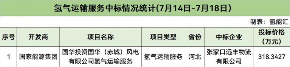 據(jù)統(tǒng)計,本周1個氫氣運輸服務(wù)項目開標(biāo),該項目為國華投資國華(赤城)風(fēng)電有限公司氫氣運輸服務(wù),由張家口遠(yuǎn)豐物流有限公司中標(biāo),投標(biāo)報價為318.3427萬元。
