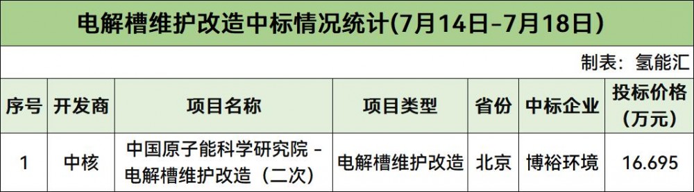 電解槽維護(hù)改造項目有1個,開發(fā)商是中核,中標(biāo)企業(yè)為博裕環(huán)境。