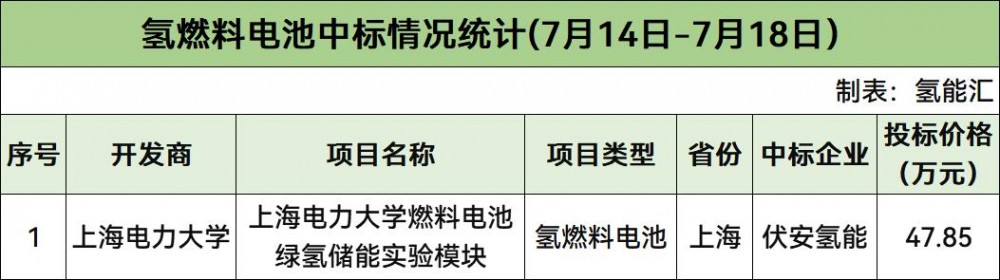 氫燃料電池項目有1個,開發(fā)商是上海電力大學(xué),中標(biāo)企業(yè)為伏安氫能。