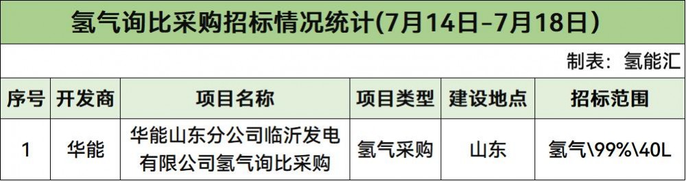 據(jù)統(tǒng)計,本周氫氣采購招標(biāo)市場方面,共1個項目啟動采購,項目是華能山東分公司臨沂發(fā)電有限公司氫氣詢比采購,招標(biāo)人是華能。