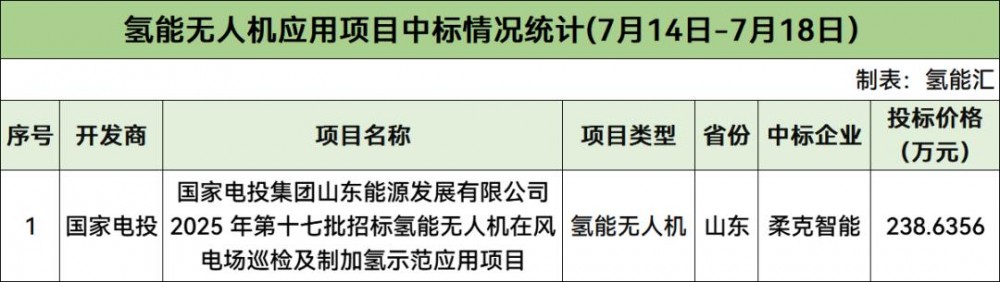 據(jù)統(tǒng)計,本周1個氫能無人機(jī)應(yīng)用項目開標(biāo),該項目為國家電投集團(tuán)山東能源發(fā)展有限公司 2025 年第十七批招標(biāo)氫能無人機(jī)在風(fēng)電場巡檢及制加氫示范應(yīng)用項目,由上海柔克智能科技有限公司中標(biāo),投標(biāo)報價238.6356萬元。