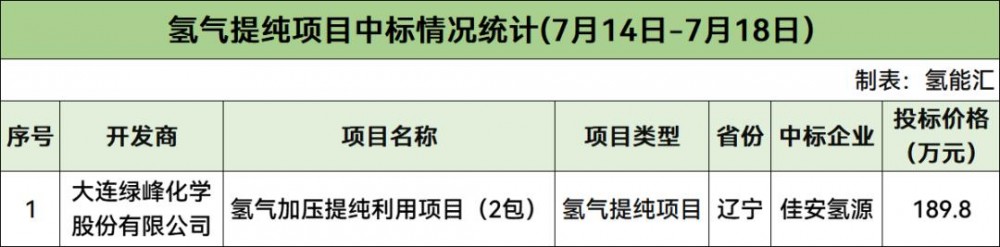 氫氣提純項目有1個,開發(fā)商是大連綠峰化學(xué)股份有限公司,中標(biāo)企業(yè)為佳安氫源。
