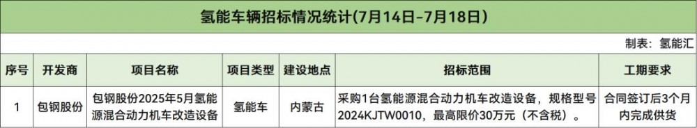 據(jù)統(tǒng)計,本周氫能車項目招標(biāo)市場方面,共1個項目啟動采購,項目是包鋼股份2025年5月氫能源混合動力機(jī)車改造設(shè)備,招標(biāo)人為包鋼股份。