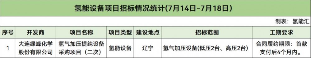 據(jù)統(tǒng)計,本周氫能設(shè)備招標(biāo)市場方面,共1個項目啟動采購,項目是氫氣加壓提純設(shè)備采購項目(二次),招標(biāo)人是大連綠峰化學(xué)股份有限公司。