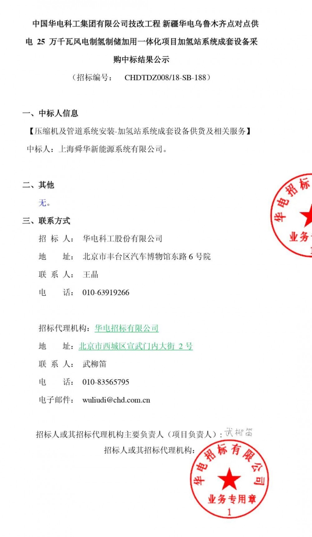 華電烏魯木齊點對點供電25萬千瓦風電制氫制儲加用一體化項目日前完成了加氫站系統成套設備采購招標,舜華新能源以綜合評分第一的優勢中標該標段。