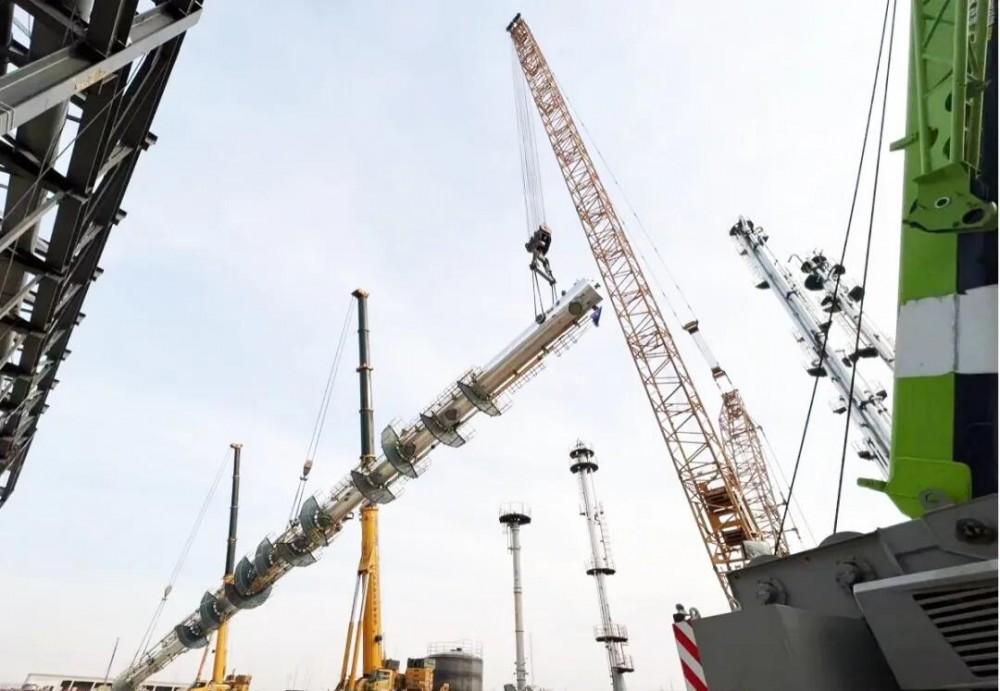 2025年3月,項目低溫甲醇洗裝置吸收塔成功吊裝就位。由于廠區(qū)布局緊湊,吊裝施工區(qū)域有限,為了順利完成高74米、起吊重量182噸的吸收塔吊裝作業(yè),項目團隊反復模擬,最終采用三機抬吊的施工方案,在700噸履帶式起重機主吊、600噸、300噸兩臺汽車吊的高效協(xié)同作業(yè)下,順利實現(xiàn)“塔起燈亮”吊裝就位。標志著項目大型設備吊裝任務全部完成,正式進入設備安裝與調試階段。