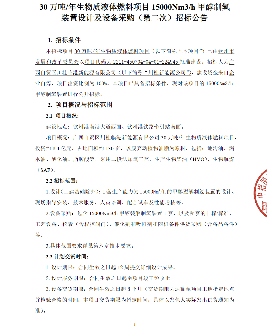 7月30日,30萬噸/年生物質液體燃料項目15000Nm3/h甲醇制氫裝置設計及設備采購(第二次)-招標公告。
