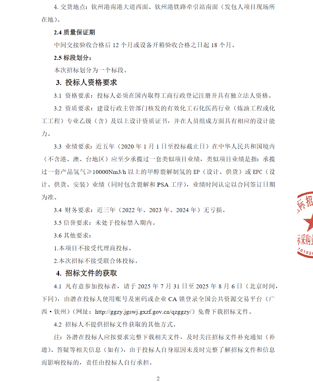 2、設備采購:包含15000Nm3/h甲醇裂解制氫裝置1套,以及配套的非標/標準、工藝設備、儀表(含程控閥門)、催化劑和吸附劑和隨機備件供貨備采購(含備品備件)等。