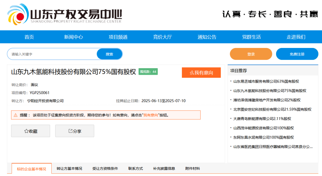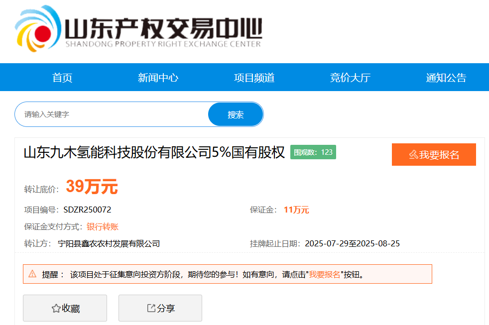 此前6月13日,山東產(chǎn)權(quán)交易中心發(fā)布“山東九木氫能科技股份有限公司75%國(guó)有股權(quán)”信息,并未轉(zhuǎn)讓5%國(guó)有股權(quán)。