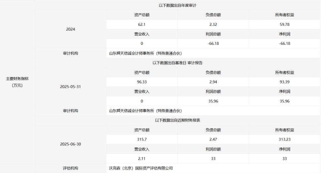 據(jù)轉(zhuǎn)讓公告披露,山東九木氫能科技股份有限公司2024年?duì)I業(yè)收入0萬(wàn)元,利潤(rùn)總額-66.18萬(wàn)元,凈利潤(rùn)-66.18。截至2025年6月30日,公司資產(chǎn)總額315.7萬(wàn)元,負(fù)債總額2.47萬(wàn)元,營(yíng)業(yè)收入2.11萬(wàn)元,凈利潤(rùn)33萬(wàn)元。