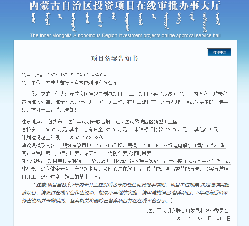 據(jù)內(nèi)蒙古自治區(qū)投資項目在線審批辦事大廳消息,8月1日,包頭達茂蒙發(fā)國富綠電制氫項目備案。