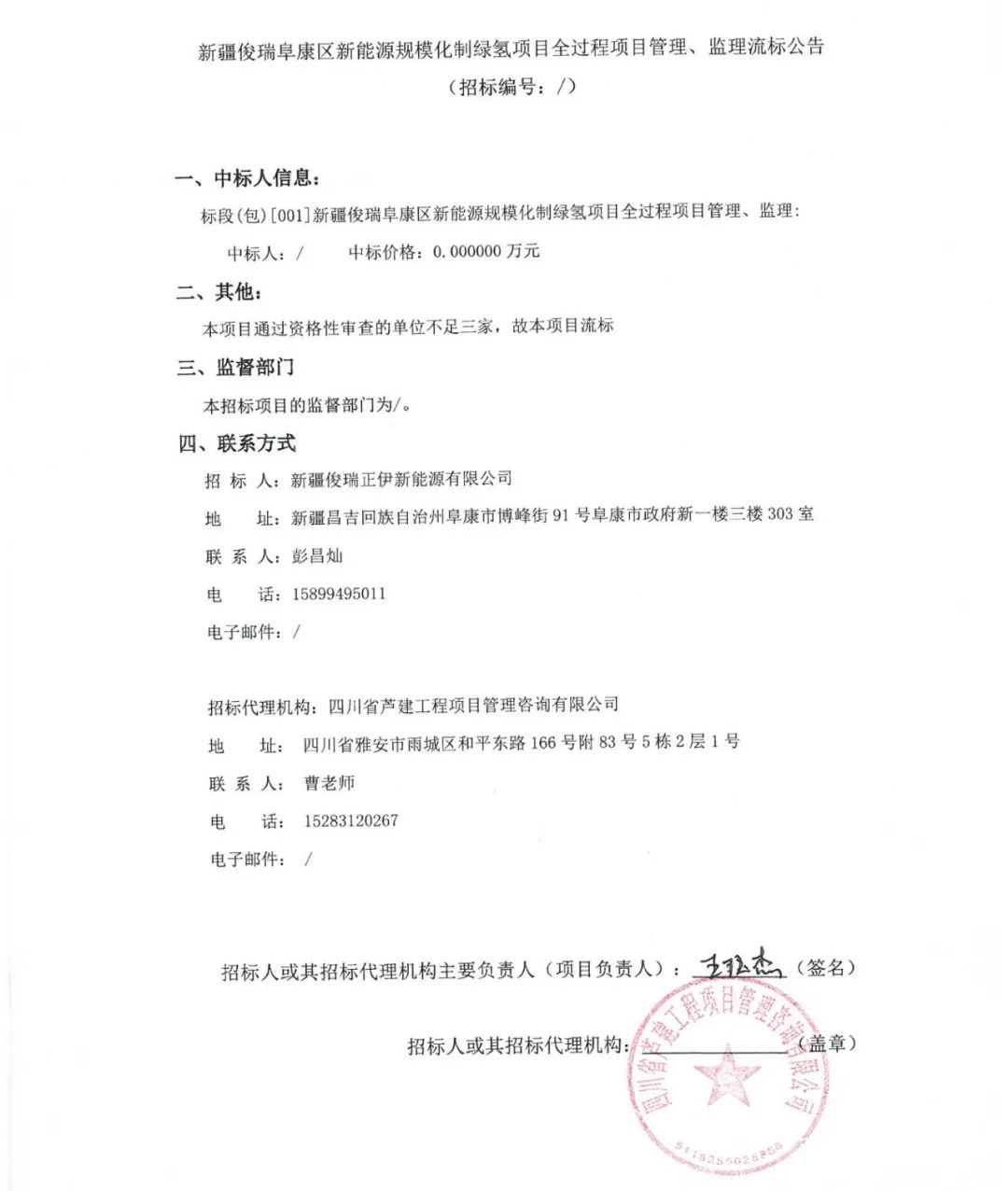 8月1日,新疆俊瑞阜康區新能源規?;凭G氫項目全過程項目管理、監理流標公告。公告表示,項目通過資格性審查的單位不足三家,故項目流標。