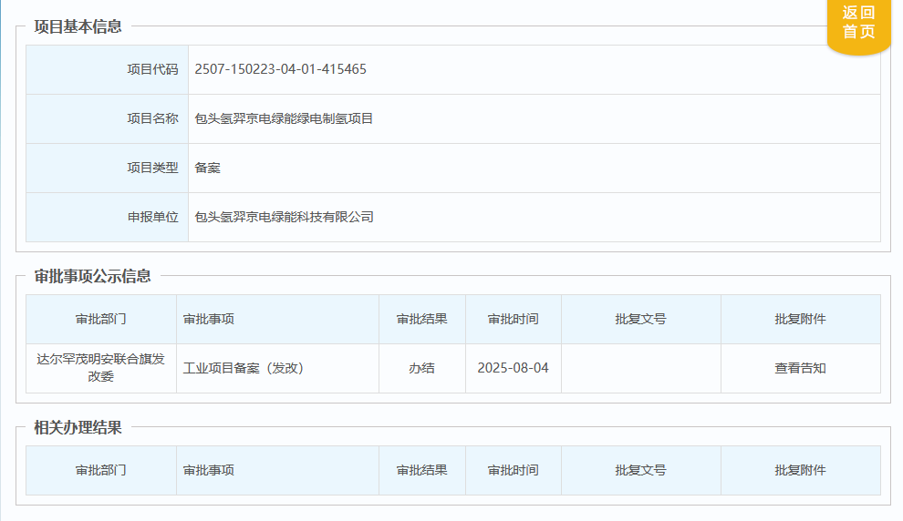 8月4日,內蒙古自治區投資項目在線審批大廳發布包頭氫羿京電綠能綠電制氫項目批復公告。