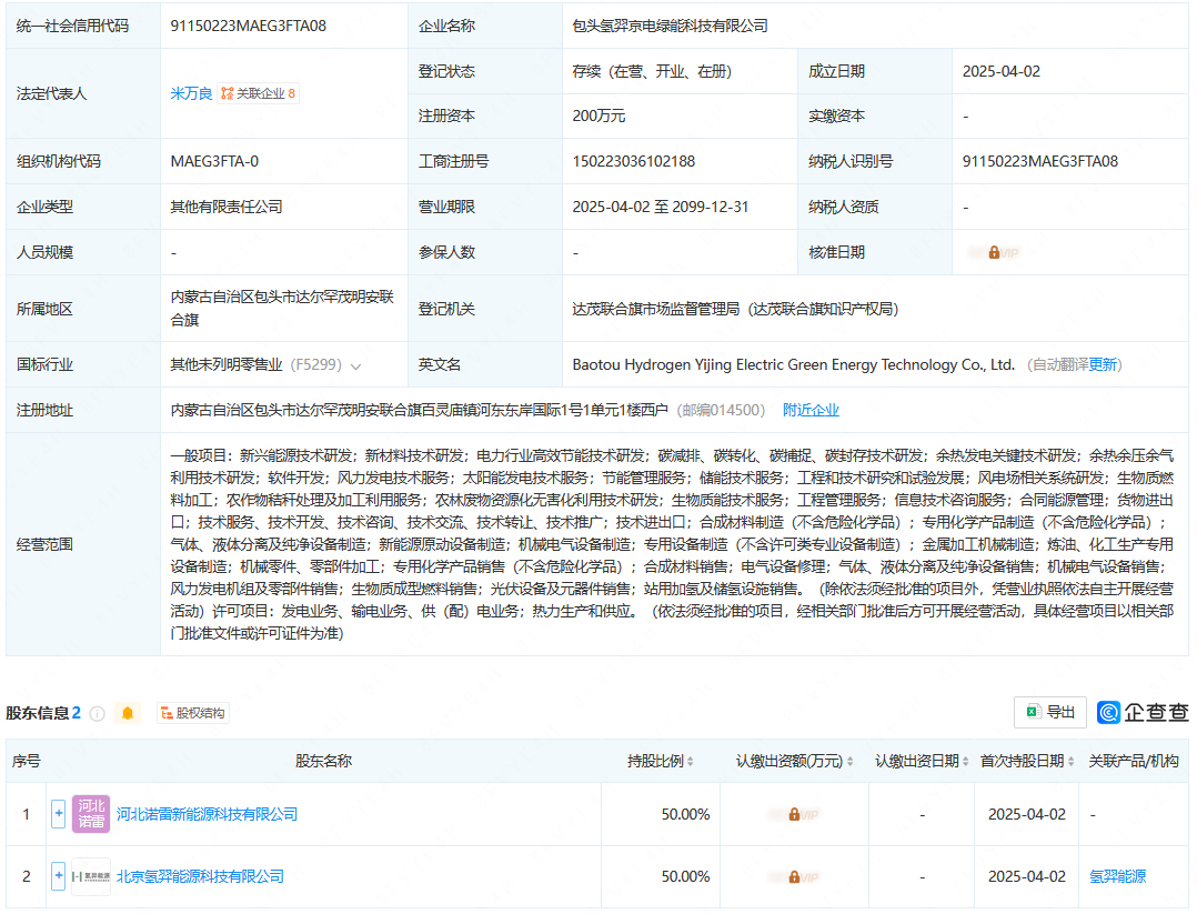 據了解,包頭氫羿京電綠能科技有限公司為北京氫羿能源科技有限公司子公司。