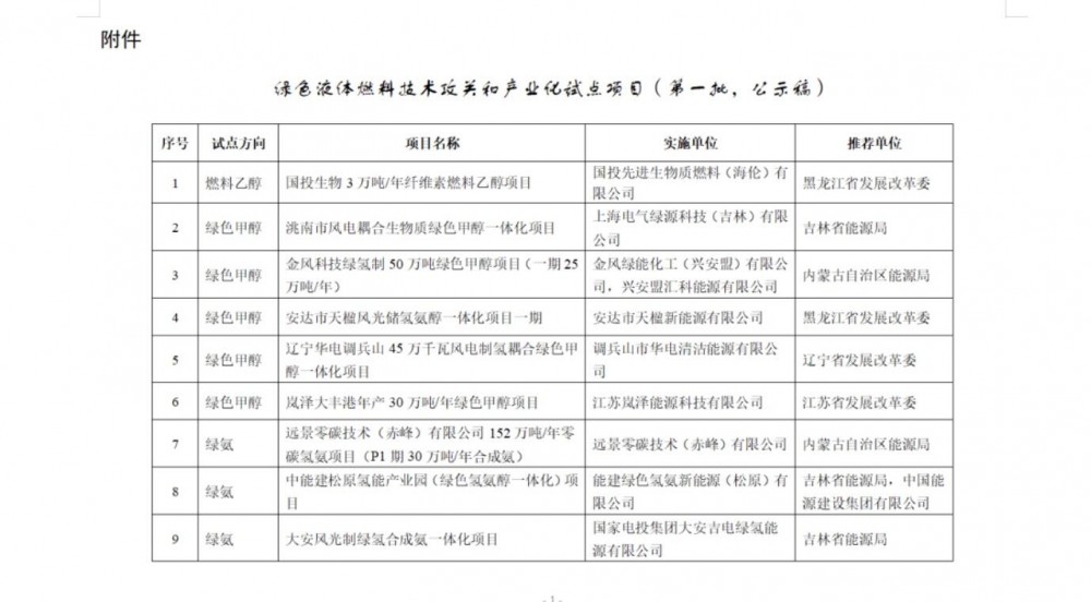 根據(jù)項(xiàng)目名單,包括9個(gè)試點(diǎn)項(xiàng)目,其中試點(diǎn)方向?yàn)榫G色甲醇和綠氨共計(jì)8個(gè),分別為:洮南市風(fēng)電耦合生物質(zhì)綠色甲醇一體化項(xiàng)目、金風(fēng)科技綠氫制50萬(wàn)噸綠色甲醇項(xiàng)目(一期25萬(wàn)噸/年)、安達(dá)市天楹風(fēng)光儲(chǔ)氫氨醇一體化項(xiàng)目一期、遼寧華電調(diào)兵山45萬(wàn)千瓦風(fēng)電制氫耦合綠色甲醇一體化項(xiàng)目、嵐?jié)纱筘S港年產(chǎn)30萬(wàn)噸/年綠色甲醇項(xiàng)目、遠(yuǎn)景零碳技術(shù)(赤峰)有限公司152萬(wàn)噸/年零碳?xì)浒表?xiàng)目(P1期30萬(wàn)噸/年合成氨)、中能建松原氫能產(chǎn)業(yè)園(綠色氫氨醇一體化)項(xiàng)目、大安風(fēng)光制綠氫合成氨一體化項(xiàng)目。