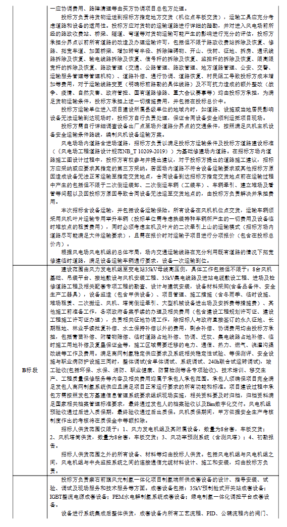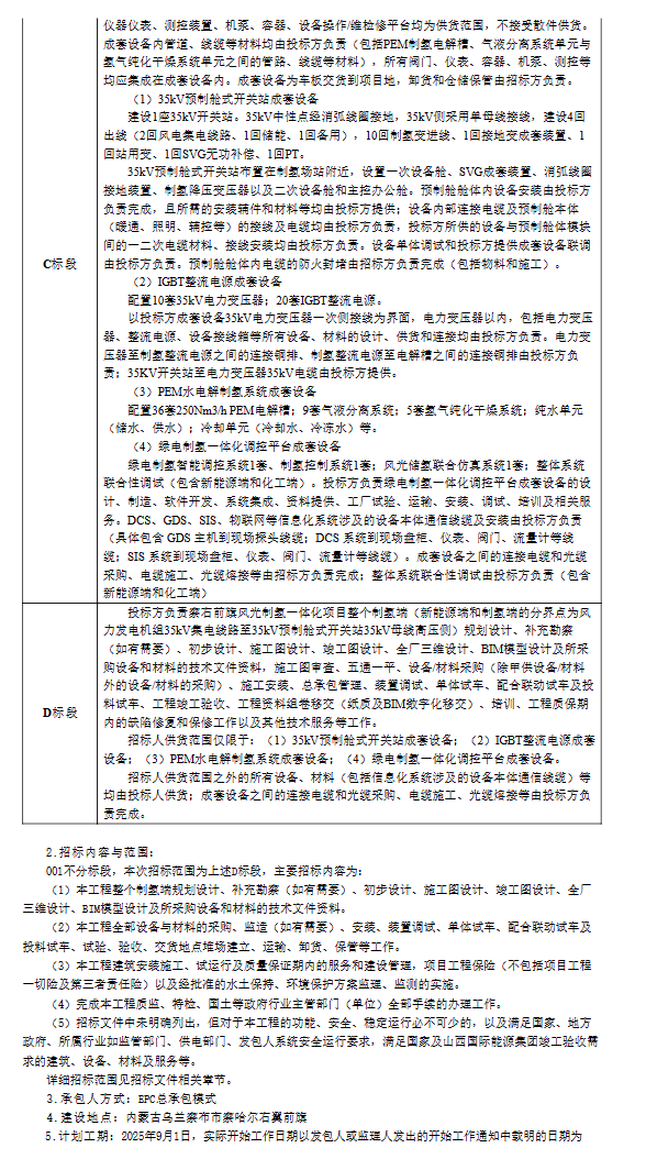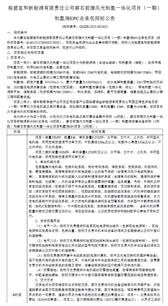 本次招標(biāo)共計(jì)分為四個(gè)標(biāo)段,分別為風(fēng)力發(fā)電機(jī)組及其附屬設(shè)各集中采購(gòu)(A標(biāo)段)、察右前期風(fēng)光制氫一體化項(xiàng)目新能源部分EPC總承包(B標(biāo)段)、察右前旗風(fēng)光制氫一體化項(xiàng)目(一期)制氫端成套設(shè)備采購(gòu)(C標(biāo)段)和察右前旗風(fēng)光制氫一體化項(xiàng)目制氫端EPC項(xiàng)目(D標(biāo)段)。