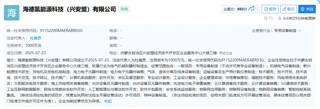 據(jù)企查查信息顯示,海德氫能源科技(興安盟)有限公司于2025-07-23成立,法定代表人為杜嘉恩,注冊資本為1000萬元。