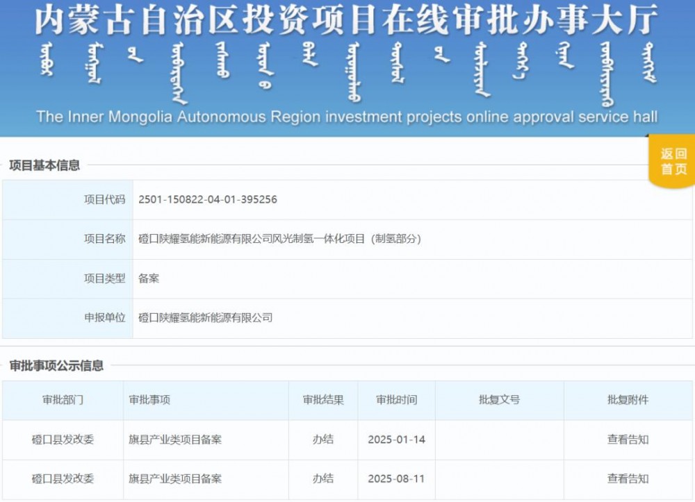 8月11日,磴口陜耀氫能新能源有限公司風光制氫一體化項目(制氫部分)獲備案。