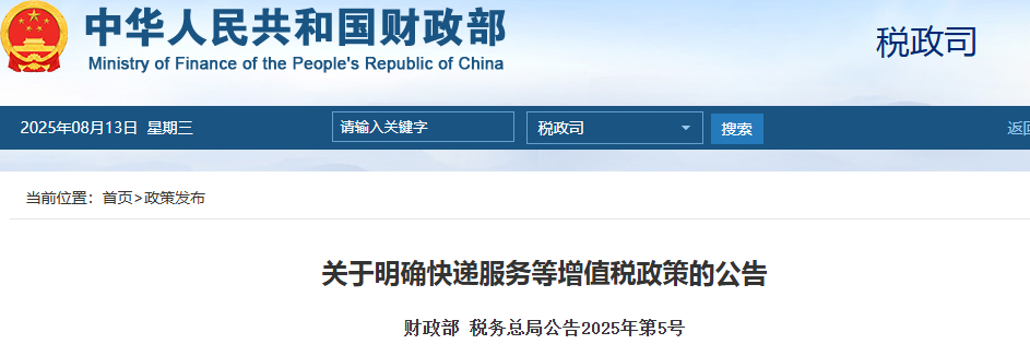 8月13日,財政部發布《關于明確快遞服務等增值稅政策的公告》。