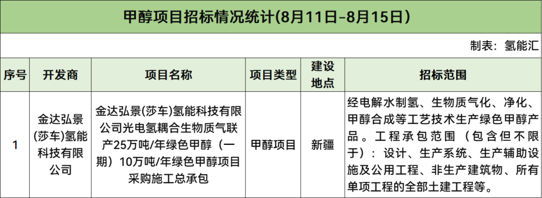 甲醇項目有1個,招標人是金達弘景(莎車)氫能科技有限公司。