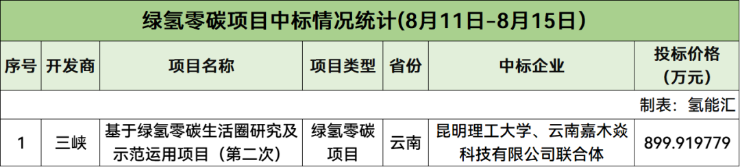 綠氫零碳項目有1個,開發商是三峽,中標企業為昆明理工大學、云南嘉木焱科技有限公司聯合體。