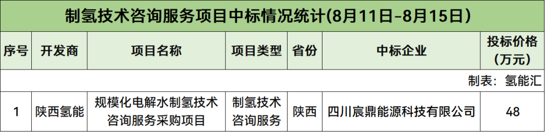 制氫技術咨詢服務有1個,開發商是陜西氫能,中標企業為四川宸鼎能源科技有限公司。