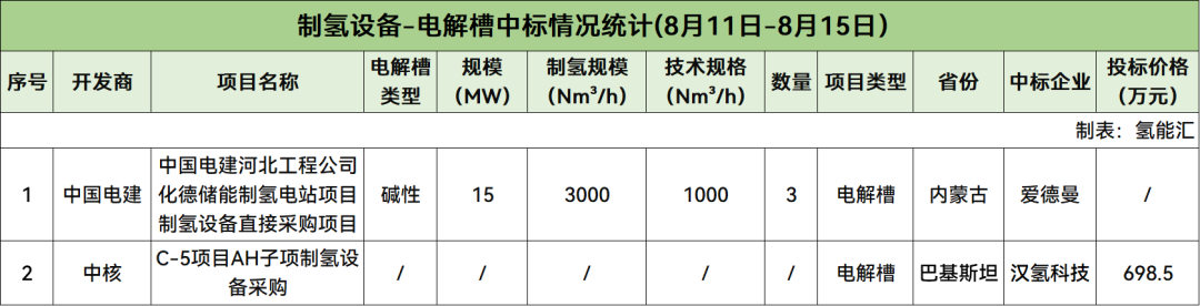 電解槽項目有2個,開發商分別是中國電建、中核,中標企業分別為愛德曼、漢氫科技。