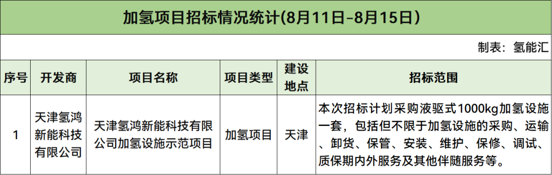 加氫項目有1個,招標人是天津氫鴻新能科技有限公司。
