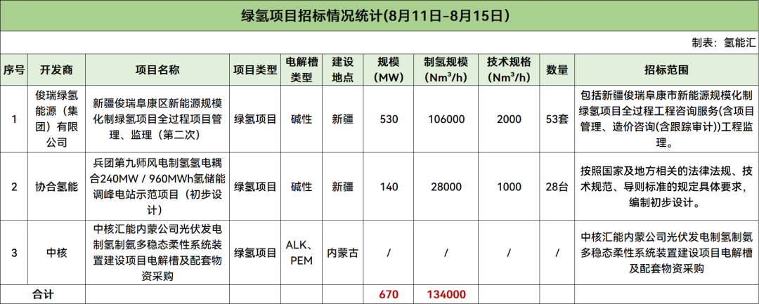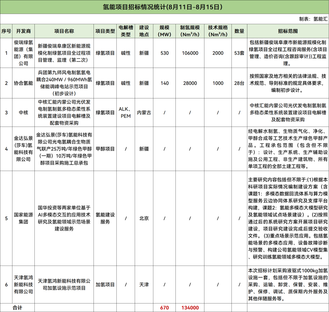 據統計,8月11日-8月15日氫能項目招投標方面,累計中標項目有6個,規模總計15MW,制氫規模總計3000Nm3/h。招標項目有7個,規模總計670MW,制氫規模總計134000Nm3/h。