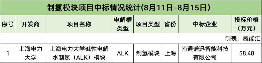 據統計,本周1個制氫模塊項目開標,項目為上海電力大學堿性電解水制氫(ALK)模塊,由南通譜迅智能科技有限公司中標,投標報價為58.48萬元。