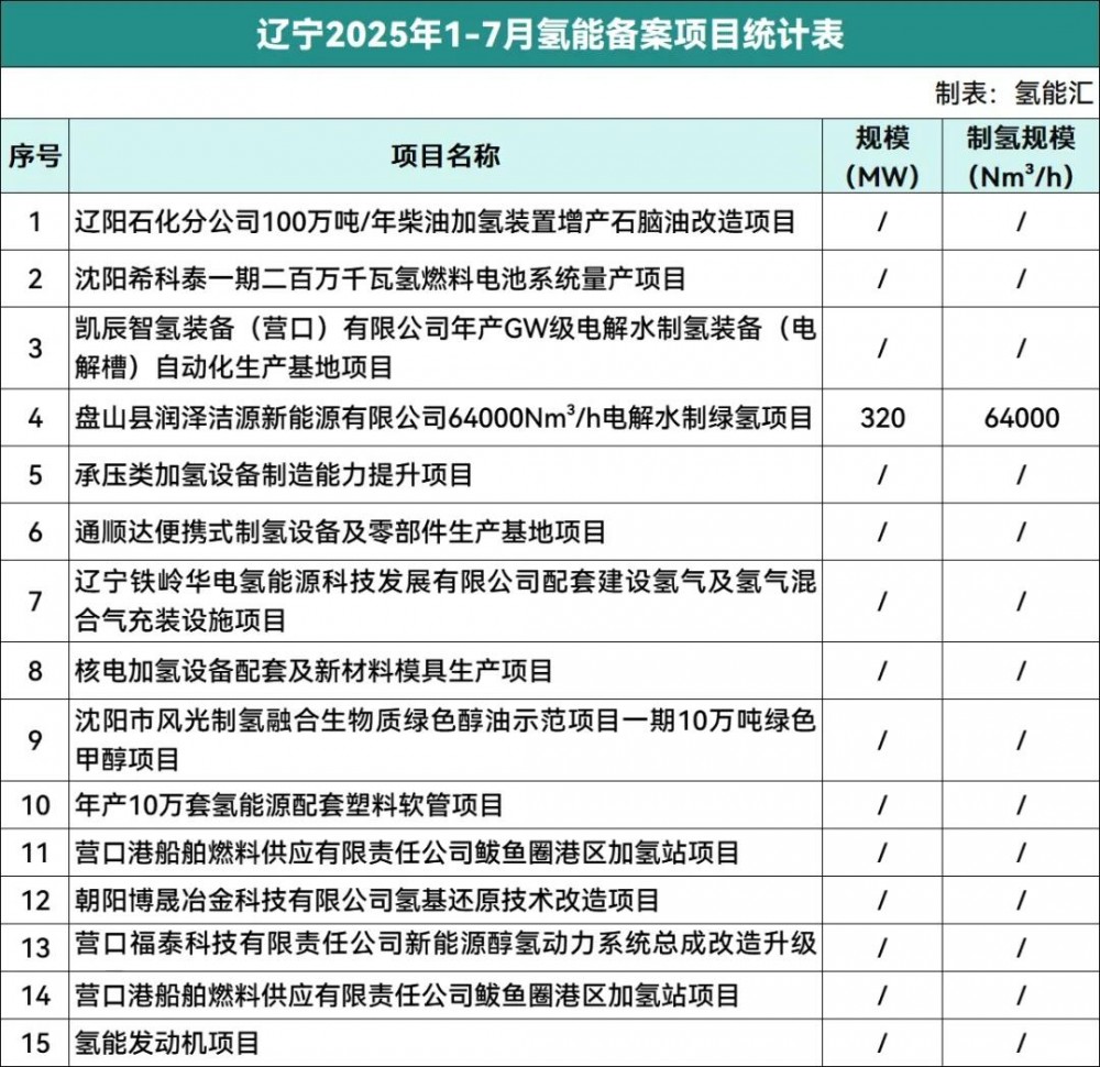遼寧氫能備案項目15個,規模總計320MW,制氫規模總計64000Nm3/h。