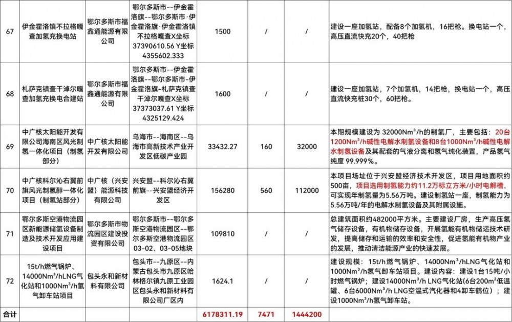 內蒙古氫能備案項目72個,項目投資合計為6178311.19萬元,規模總計7471MW,制氫規模總計1444200Nm3/h。