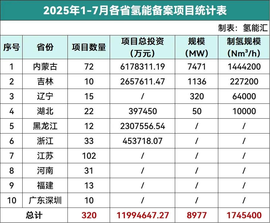 根據公開信息不完全統計,2025年1-7月全國各省完成備案的氫能項目共計320個,投資總計11994647.27萬元(約1199.46億元),規模總計8977MW,制氫規模總計1745400Nm3/h。